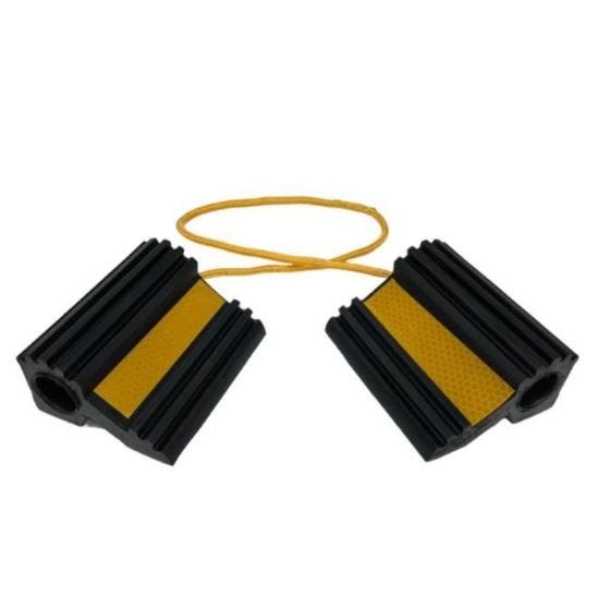 These durable, low profile chocks are just the right size for Cirrus and other aircraft with low wheel pant clearance. Rigged surface provides good traction against the wheel. Made out of rubber with reflective yellow strips on two sides. Measures approx. 2” high x 4.5” wide. Connected by a 1/4” rope approx. 24” long. Weighs 1.6 lbs..