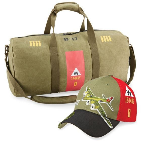 Modeled after WWII barrel-shaped equipment bags, our B-17 Flying Fortress Bomber Bag is an all-purpose travel bag, ideal for long trips, everyday use, an overnighter, or a trip to the gym. The Bag features a detachable & adjustable shoulder strap and web carry handles for added durability. Screen printed graphics appear on all sides for added value. On the right side, a red panel replicates familiar tail markings. On the left, is the American Flag, while 16 bombing missions are indicated on both sides. On the end of the Bag is a B-17 Bomber Silhouette and on the other is the USAF logo. Bag is made of 16 oz. olive drab cotton canvas and includes two end pockets with zipper closures, and a heavy-duty zipper closure for the main opening. Measures 24”l x 8”h x 12”w.