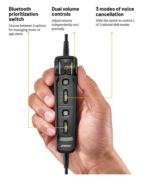 The A30 features a completely digital ANR system to provide full attenuation across a wide variety of noise environments, from loud warbirds to quiet jets. Enhanced direct wind noise rejection means better ANR performance when the vent is blowing on a hot summer day, and the firmware is upgradeable to take advantage of new technology. Best of all, these features do not reduce Bose’s famously long battery life: at least 45 hours of use, or 25 when using Bluetooth for external audio.
