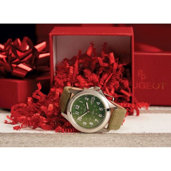 The A-11 was known as the watch that kept the USAAF, Navy and Marines flying and the wristwatch that helped win the war. This Watch features a breathable canvas olive band that’s adjustable, a fatigue green colored dial, quartz movement, silver-tone numerals supported by 24- hour military time, and a clean stainless steel bezel that frames the dial perfectly. Water-resistant to 3ATM (96 feet). Case measures about 40mm in dia. and 10mm thick. Comes with a limited lifetime warranty. Battery operated.