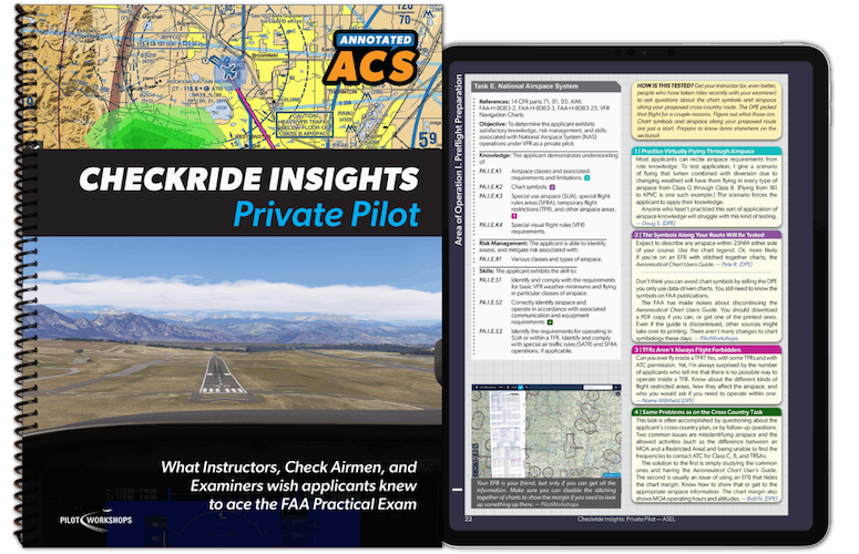 We developed a simple solution to this problem … We’ve taken the ACS and marked it up with comments and guidance from chief instructors, check airmen, and designated pilot examiners (DPEs). They tell you in plain language how each task is tested and what your examiner will really be looking for. You’ll learn the questions you’re likely to be asked, how to avoid common mistakes, and how to make a great impression. You’ll see where and how checkrides typically fall apart, and what the best applicants do to pass.