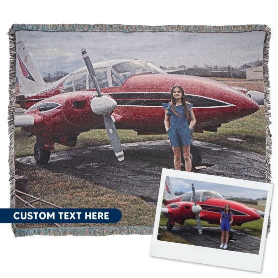 The perfect aviation home décor has arrived! Great for home décor but also useful inside the airplane for those cold flights, our custom throw is great for those who love aviation. Made in the USA, our customizable throw is woven from 100% cotton and measures 50”h x 60”w. Provide an image that’s at least 850 x 716 pixel sized image. We also offer personalization up to 15 characters across the bottom of the throw. Please allow two weeks for delivery.