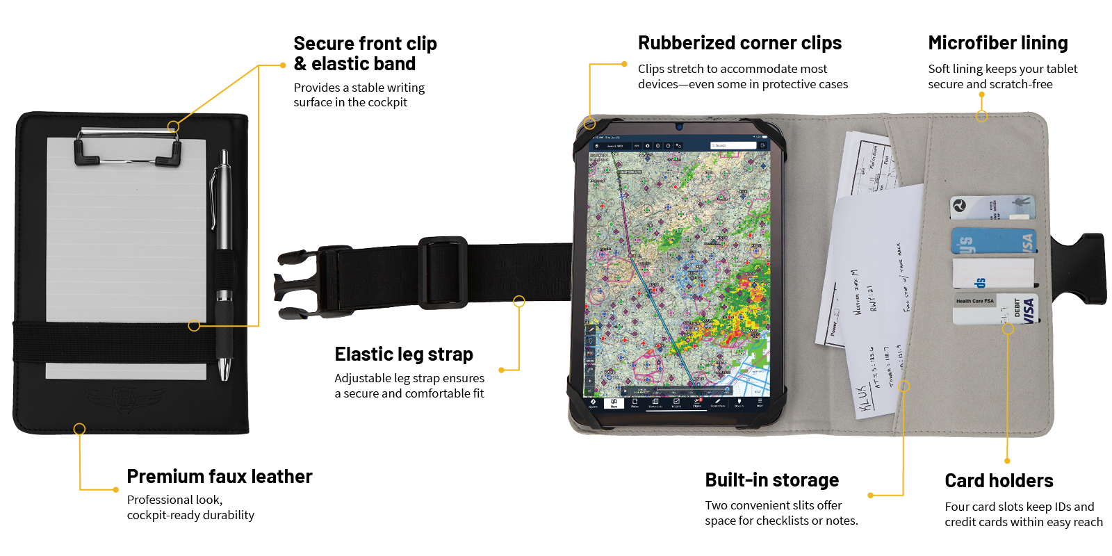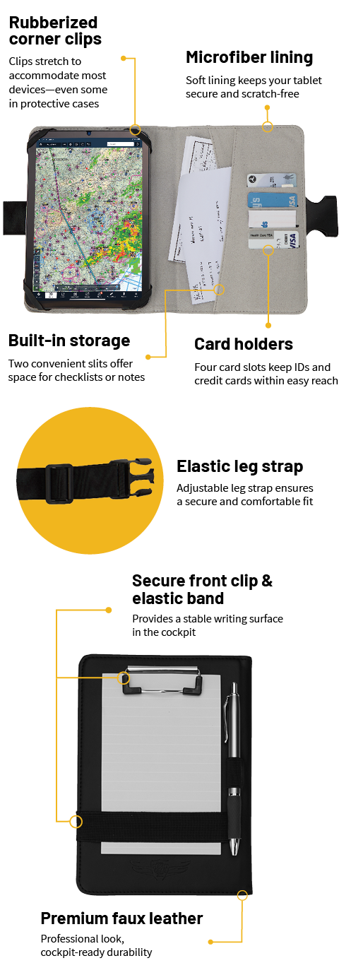 A secure front clip and elastic band hold your notepad in place, allowing quick transitions between paper notes and your EFB.