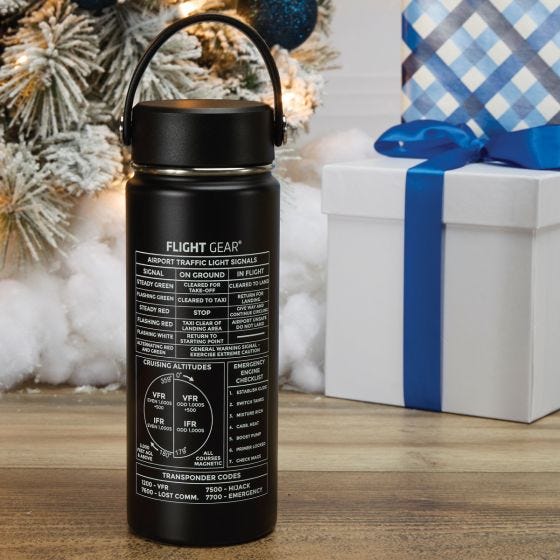 Everyone needs a good water bottle—especially pilots—and this one is designed for the cockpit. It fits easily into a flight bag or cup holder and is easy to carry. The Flight Gear Water Bottle has an comfortable carrying strap that is easy to grab on the way to the airplane. The double walled vacuum creates perfect insulation for cold refreshment on a hot day or hot coffee for a breakfast flight. Generous 18 ounce capacity.