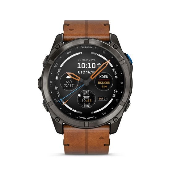 D2™ Mach 2 Pro is the ultimate Garmin aviator smartwatch, with built-in inReach® technology for satellite and LTE connectivity to keep you connected between flights (active subscription required; coverage limitations may apply; some jurisdictions regulate or prohibit the use of satellite communication devices). From your wrist, access voice calls and LiveTrack™ location sharing when you’re connected to an LTE network. Or utilize two-way messaging and interactive SOS from either an LTE or satellite link — with emergency SOS message support from Garmin ResponseSM, a 24/7-staffed international coordination center. Get convenient tools for every phase of flight, including on-device advanced aeronautical maps, HSI and Direct-to navigation. Access NEXRAD, METARs and TAFs with an LTE connection, plus set personal minimums to stay ahead of the weather. Premium touches include a durable DLC-coated titanium bezel, sapphire lens, bright 1.4" AMOLED touchscreen display and built-in LED flashlight. Advanced health and fitness features help you keep fit to fly. And with up to 24 days of battery life in smartwatch mode, D2 Mach 2 Pro is powered for life on the go.