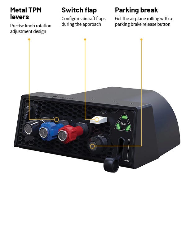 True to the Vernier Style throttles the TPM Quadrant features a push / pull option per lever, as well as twist setting changes for the propeller and mixture controls. When trying to change the RPM setting in a constant speed propeller aircraft by small amounts, it helps to have the incremental twist of the propeller control (Flying with a constant-speed propeller video tip)