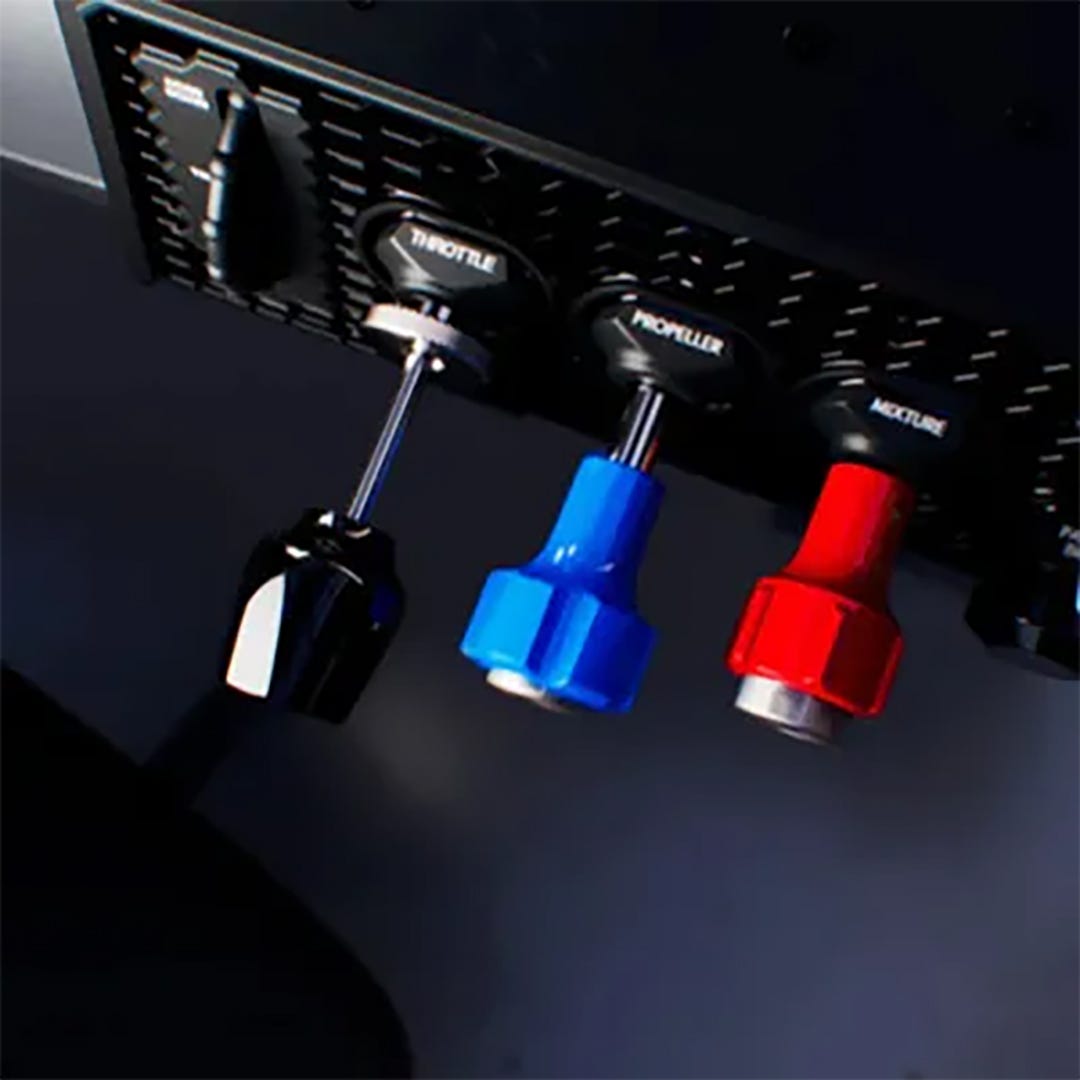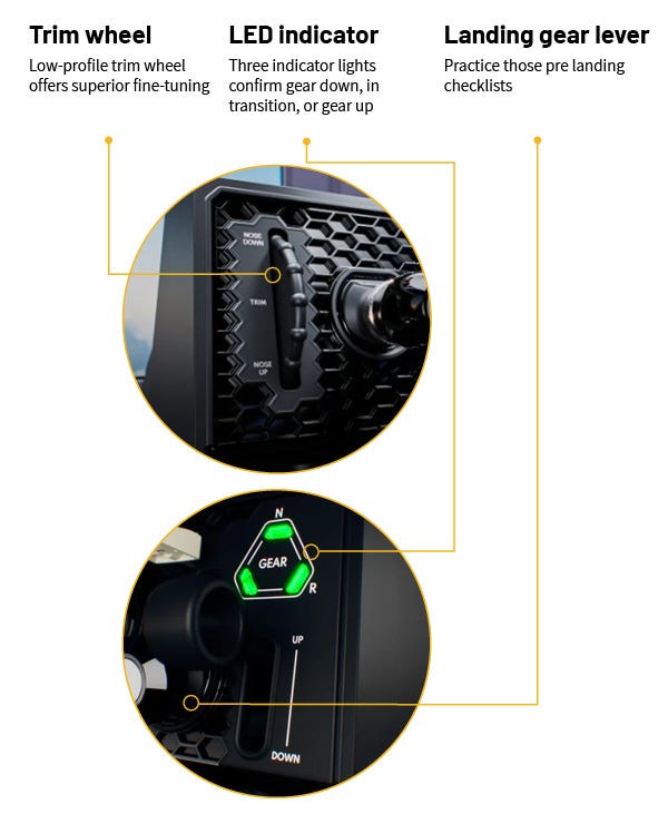 One of the benefits of flying faster aircraft is the ability to hide our landing gear from parasite drag. Just as a bird stows its hindlimbs when flying, an aircraft performs better in cruise with the gear retracted. Easily configure your aircraft for gear stowed or gear extended with the circular handle gear lever. Indicator lights will convey whether the gear is stowed, in motion, or extended.