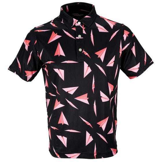 Its sublimated paper airplane silhouettes are designed to resist fading over time. Notable features include premium customized buttons, UPF 30 sun protection, antimicrobial material, a tagless design for added comfort, and a reinforced collar. This Polo is expertly tailored, allowing for the option to tuck it in or wear it untucked, ensuring versatility and comfort for all occasions. It's available in a range of sizes, from SM-XXXL, please specify size.