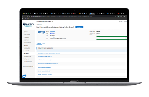 You can now view your student’s Sporty’s Course progress through Flight Schedule Pro (FSP), and Sporty’s courses can be sold through FSP. The added convenience of only needing one software to manage flight and ground scheduling, billing, maintenance, online ground school tracking, and more will add additional efficiency and savings for your Part 141 flight school.