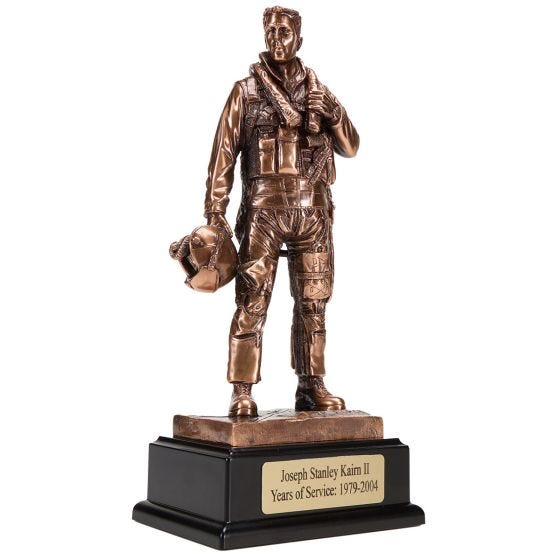 This bronze-colored resin Air Force Pilot Sculpture is crafted with intricate details, making it a stunning addition to your desk, mantel, bookshelf, or display shelf.