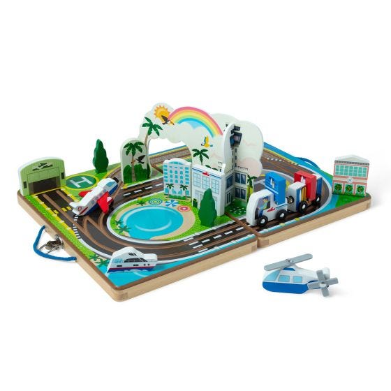 Let young imaginations take flight with this charming, travel friendly airport play set. Designed as a sturdy wooden carry case, it unfolds to reveal a detailed airport scene complete with built-in tracks, perfect for guiding airplanes, vehicles, and ground crews through a busy day on the tarmac. Inside, you’ll find a full fleet of wooden pieces including aircraft, service vehicles, buildings, and accessories, all crafted for hands-on play. When the airport is closed for the day, everything stores neatly inside, making it easy to pack up. For ages 3 and up. Includes 17 pieces. Measures 20.5”l x 15.5”w x 1” thick.