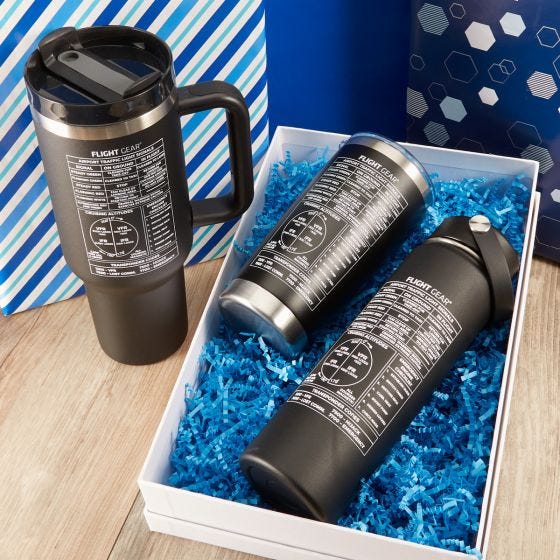 Stay refreshed and ready for any aviation journey with our Flight Gear Three-in-One Hydration Kit. Whether you're on the flight deck or cruising cross-country, we've got you covered with our range of innovative drinkware.Flight Gear Travel Mug