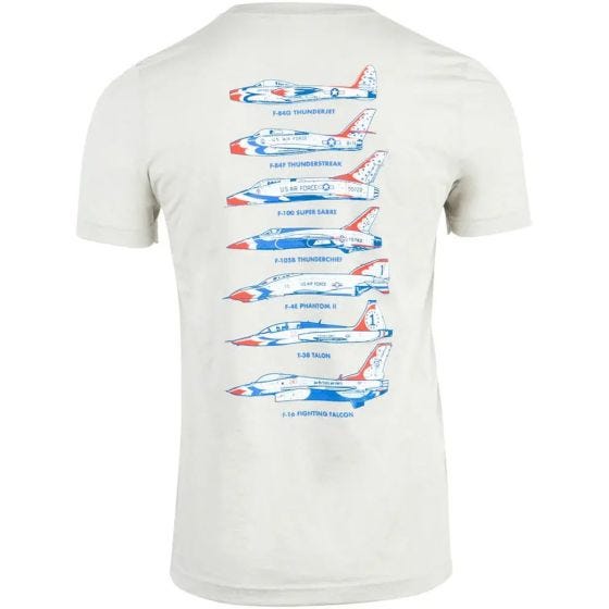 This shirt celebrates the incredible legacy of the USAF Thunderbirds, serving as a wearable timeline of one of the world's premier aerial demonstration teams from their inception to the present day. The centerpiece is the stunning graphic on the back, which showcases a chronological lineage of every major aircraft flown by the Thunderbirds. Each jet is meticulously illustrated in the team's iconic red, white, and blue livery, capturing the evolution of performance and technology through the decades. The featured aircraft include the F-84G Thunderjet, F-84F Thunderstreak, F-100 Super Sabre, F-105B Thunderchief, F-4E Phantom II, T-38 Talon, and the F-16 Fighting Falcon. For a proud but subtle statement, the front of the shirt features a classic and clean left-chest design with the iconic Thunderbirds emblem and text. Crafted from an ultra-soft and comfortable heather cement fabric, this t-shirt is designed for a modern fit and all-day comfort. Available in sizes SM-XXXL. Officially licensed.